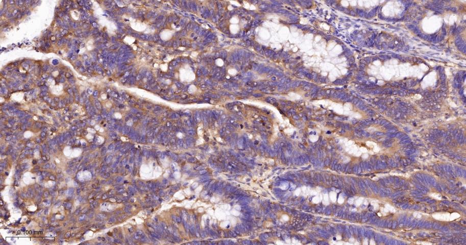 Paraformaldehyde-fixed, paraffin embedded Human Colon Cancer; Antigen retrieval by boiling in sodium citrate buffer (pH6.0) for 15 min; The section was incubated with EEF2 Monoclonal Antibody, Unconjugated (bsm-61650R) at 1:200 overnight at 4°C, followed by conjugation to the bs-0295G-HRP and DAB (C-0010) staining.