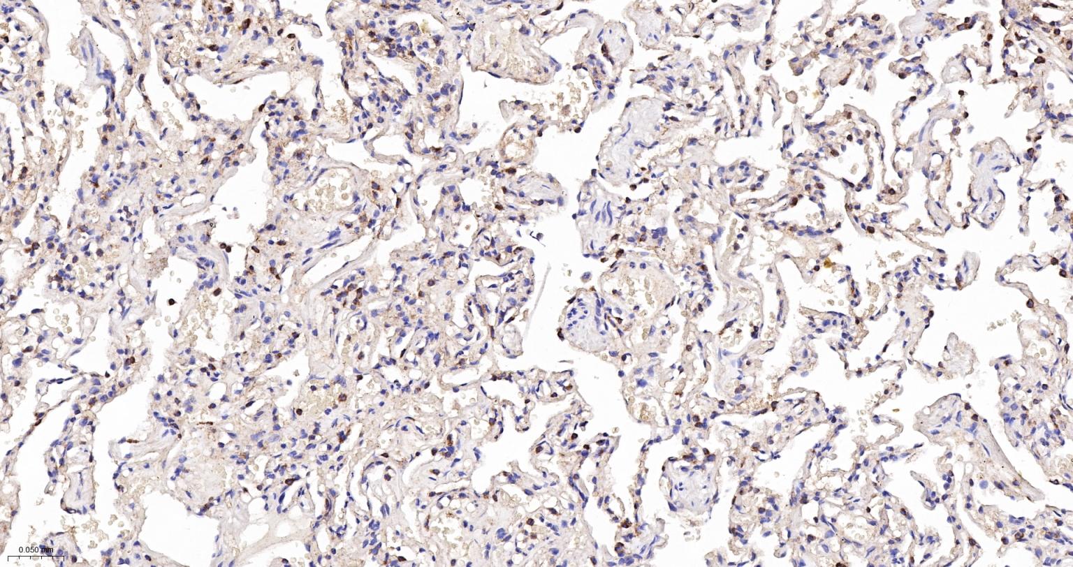Paraformaldehyde-fixed, paraffin embedded Human Lung; Antigen retrieval by boiling in sodium citrate buffer (pH6.0) for 15 min; The section was incubated with EEF2 Monoclonal Antibody, Unconjugated (bsm-61650R) at 1:200 overnight at 4°C, followed by conjugation to the bs-0295G-HRP and DAB (C-0010) staining.