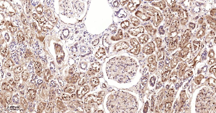 Paraformaldehyde-fixed, paraffin embedded Human Kidney; Antigen retrieval by boiling in sodium citrate buffer (pH6.0) for 15 min; The section was incubated with USP10 Monoclonal Antibody, Unconjugated (bsm-61654R) at 1:200 overnight at 4°C, followed by conjugation to the bs-0295G-HRP and DAB (C-0010) staining.
