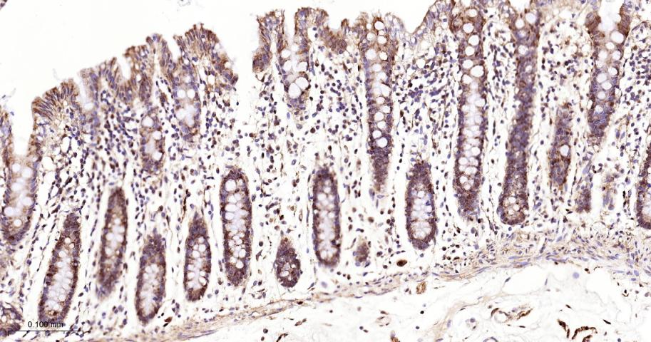 Paraformaldehyde-fixed, paraffin embedded Human Colon; Antigen retrieval by boiling in sodium citrate buffer (pH6.0) for 15 min; The section was incubated with USP10 Monoclonal Antibody, Unconjugated (bsm-61654R) at 1:200 overnight at 4°C, followed by conjugation to the bs-0295G-HRP and DAB (C-0010) staining.