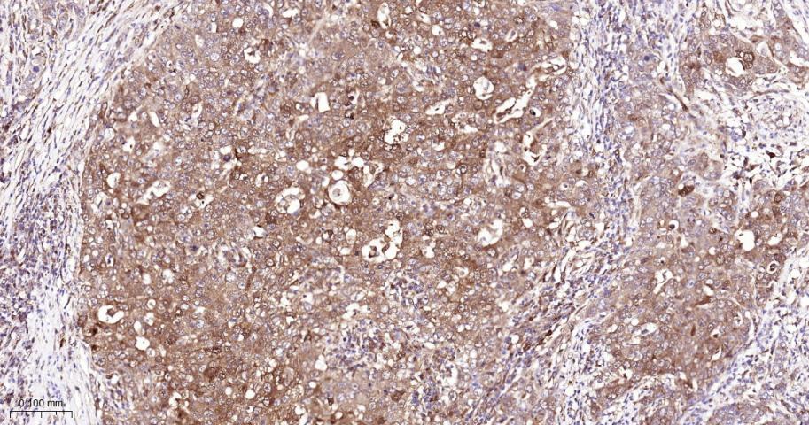 Paraformaldehyde-fixed, paraffin embedded Human Breast Cancer; Antigen retrieval by boiling in sodium citrate buffer (pH6.0) for 15 min; The section was incubated with USP10 Monoclonal Antibody, Unconjugated (bsm-61654R) at 1:200 overnight at 4°C, followed by conjugation to the bs-0295G-HRP and DAB (C-0010) staining.