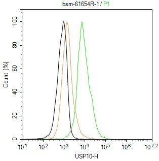 The MCF-7 (H) cells were fixed with 4% PFA (10 min at r.t.) and then permeabilized with 90% ice-cold methanol for 20 min at -20℃,the cells then were incubated in 5%BSA to block non-specific protein-protein interactions (30 min at r.t.), followed by secondary antibody incubation for 40 min at room temperature. Primary Antibody (green):Rabbit Anti-USP10 antibody (bsm-61654R,1:100); Isotype Control (orange): Rabbit IgG (bs-0295P). Blank control (black): PBS. Acquisition of 20,000 events was performed.
