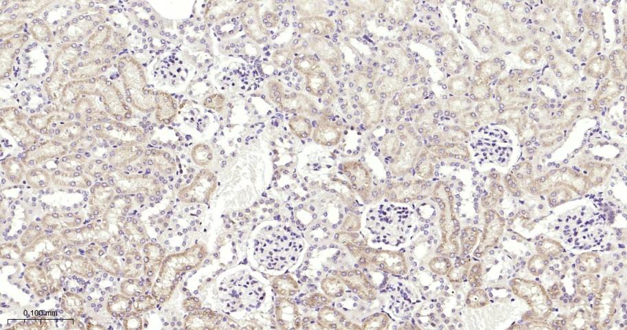 Paraformaldehyde-fixed, paraffin embedded Mouse Kidney; Antigen retrieval by boiling in sodium citrate buffer (pH6.0) for 15 min; Antibody incubation with FADD Monoclonal Antibody, Unconjugated(bsm-61661R) at 1:200 overnight at 4°C, followed by conjugation to the bs-0295G-HRP and DAB (C-0010) staining.