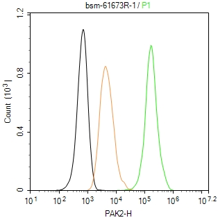 The Hela (H) cells were fixed with 4% PFA (10 min at r.t.) and then permeabilized with 90% ice-cold methanol for 20 min at -20℃,the cells then were incubated in 5%BSA to block non-specific protein-protein interactions (30 min at r.t.), followed by secondary antibody incubation for 40 min at room temperature. Primary Antibody (green):Rabbit Anti-PAK2 antibody (bsm-61673R,1:100); Isotype Control (orange): Rabbit IgG (bs-0295P). Blank control (black): PBS. Acquisition of 20,000 events was performed.