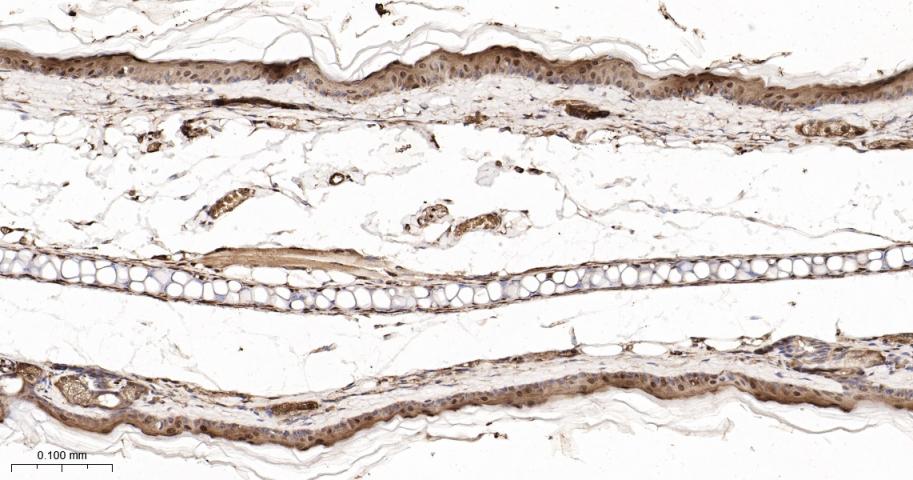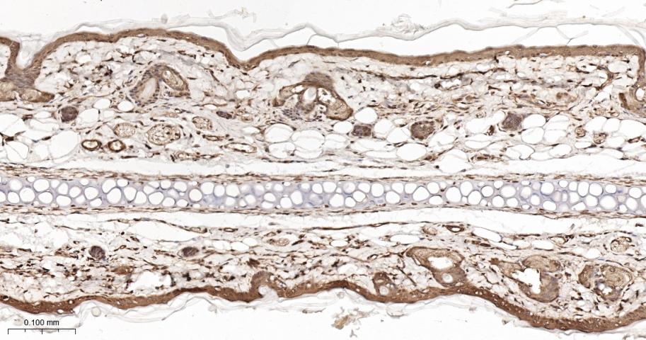 Paraformaldehyde-fixed, paraffin embedded Rat Skin; Antigen retrieval by boiling in sodium citrate buffer (pH6.0) for 15 min; The section was incubated with PAK2 Monoclonal Antibody, Unconjugated (bsm-61673R) at 1:200 overnight at 4°C, followed by conjugation to the bs-0295G-HRP and DAB (C-0010) staining.