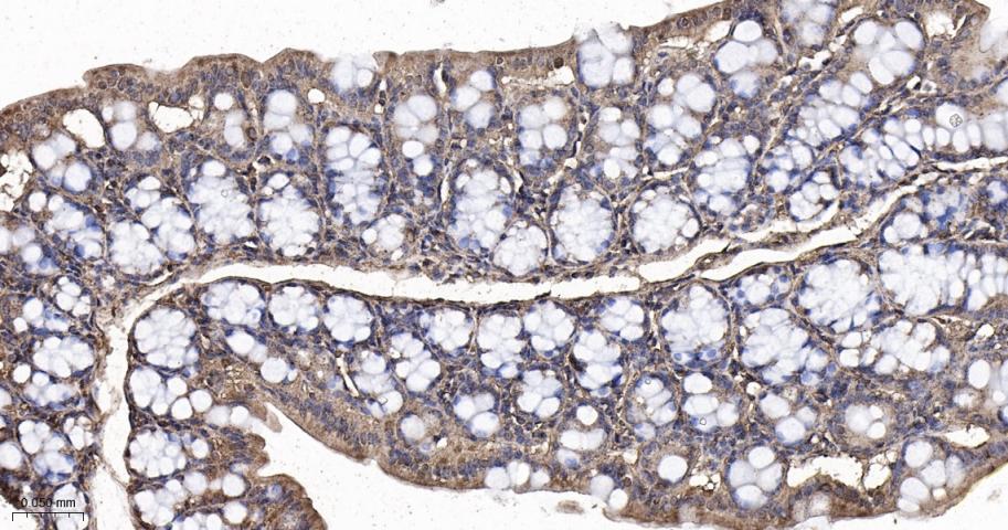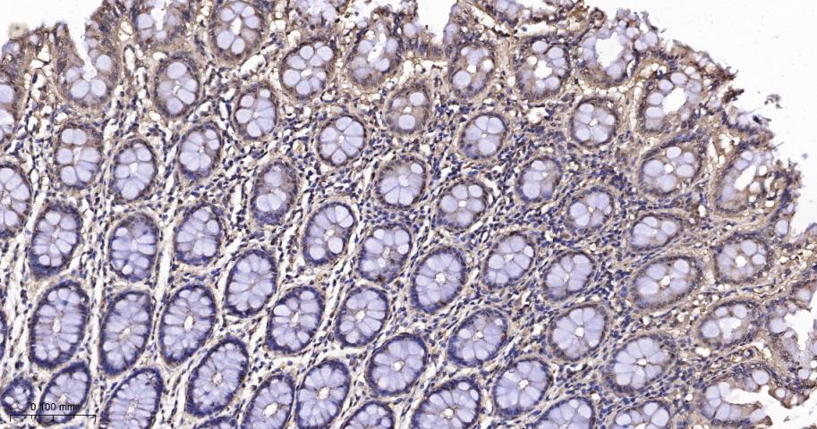Paraformaldehyde-fixed, paraffin embedded Mouse Colon; Antigen retrieval by boiling in sodium citrate buffer (pH6.0) for 15 min; The section was incubated with PAK2 Monoclonal Antibody, Unconjugated (bsm-61673R) at 1:200 overnight at 4°C, followed by conjugation to the bs-0295G-HRP and DAB (C-0010) staining.