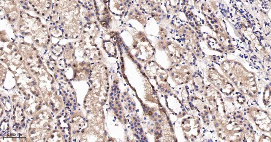 Paraformaldehyde-fixed, paraffin embedded Human Kidney; Antigen retrieval by boiling in sodium citrate buffer (pH6.0) for 15 min; The section was incubated with PAK2 Monoclonal Antibody, Unconjugated (bsm-61673R) at 1:200 overnight at 4°C, followed by conjugation to the bs-0295G-HRP and DAB (C-0010) staining.