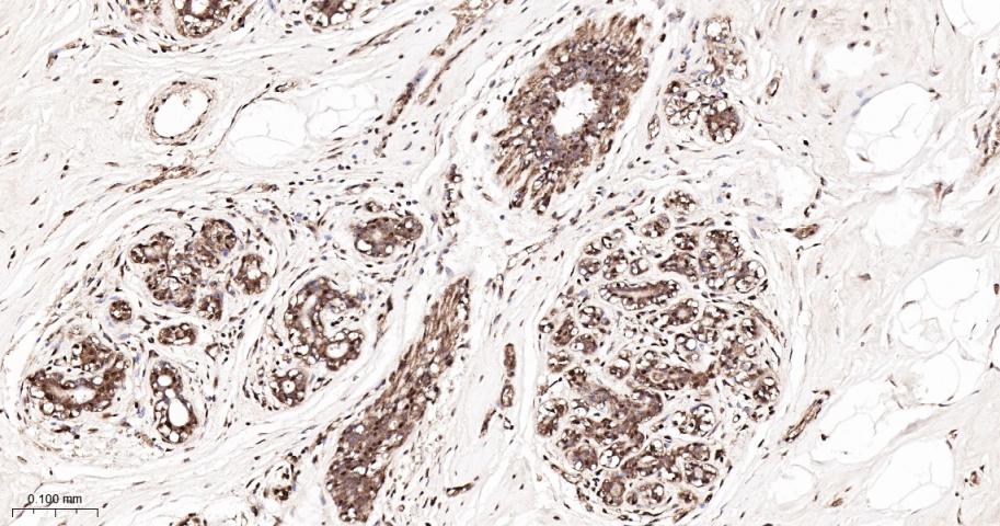 Paraformaldehyde-fixed, paraffin embedded Human Breast Cancer; Antigen retrieval by boiling in sodium citrate buffer (pH6.0) for 15 min; The section was incubated with PAK2 Monoclonal Antibody, Unconjugated (bsm-61673R) at 1:200 overnight at 4°C, followed by conjugation to the bs-0295G-HRP and DAB (C-0010) staining.