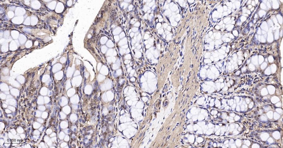 Paraformaldehyde-fixed, paraffin embedded Human Colon; Antigen retrieval by boiling in sodium citrate buffer (pH6.0) for 15 min; The section was incubated with PAK2 Monoclonal Antibody, Unconjugated (bsm-61673R) at 1:200 overnight at 4°C, followed by conjugation to the bs-0295G-HRP and DAB (C-0010) staining.