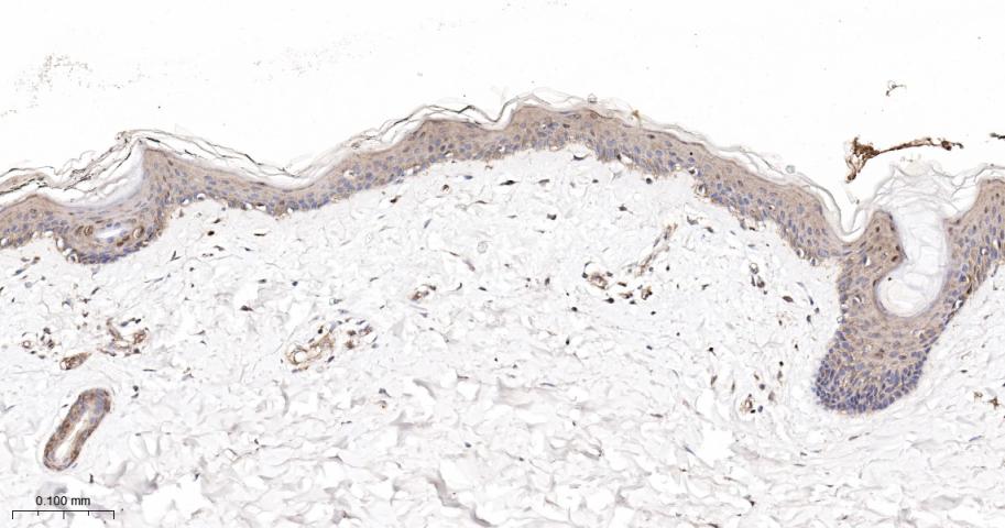 Paraformaldehyde-fixed, paraffin embedded Human Skin; Antigen retrieval by boiling in sodium citrate buffer (pH6.0) for 15 min; The section was incubated with PAK2 Monoclonal Antibody, Unconjugated (bsm-61673R) at 1:200 overnight at 4°C, followed by conjugation to the bs-0295G-HRP and DAB (C-0010) staining.
