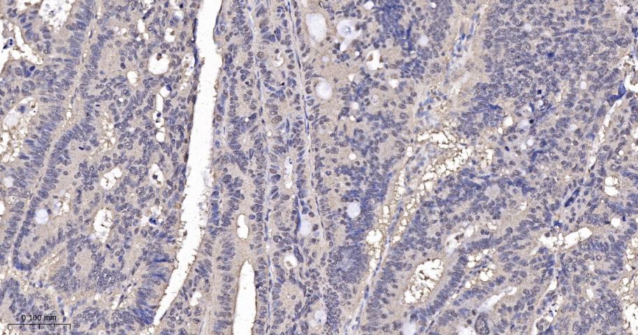Paraformaldehyde-fixed, paraffin embedded Human Colon Cancer; Antigen retrieval by boiling in sodium citrate buffer (pH6.0) for 15 min; The section was incubated with PAK2 Monoclonal Antibody, Unconjugated (bsm-61673R) at 1:200 overnight at 4°C, followed by conjugation to the bs-0295G-HRP and DAB (C-0010) staining.