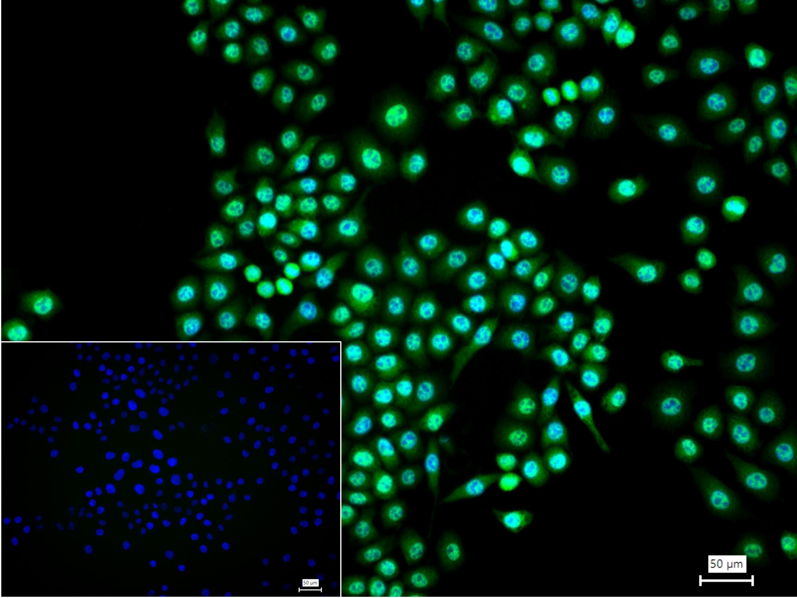4% Paraformaldehyde-fixed Hela (H) cell; Triton X-100 at r.t. for 20 min; Antibody incubation with (PAK2) monoclonal Antibody, unconjugated (bsm-61673R) 1:100, 90 min at 37°C; followed by BF488 conjugated Goat Anti-Rabbit IgG antibody (green, bs-60295G-BF488) at 37°C for 90 min, DAPI (blue, C02-04002) was used to stain the cell nuclei. PBS instead of the primary antibody was used as the blank control.