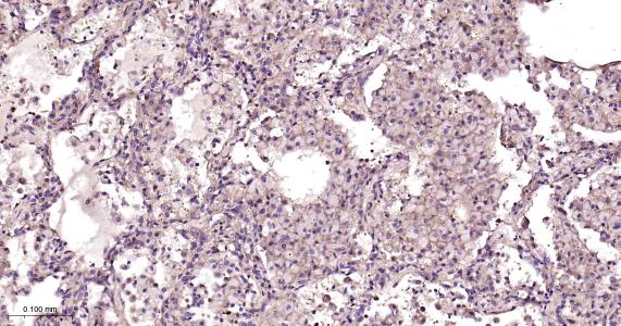 Paraformaldehyde-fixed, paraffin embedded Human Lung Cancer; Antigen retrieval by boiling in sodium citrate buffer (pH6.0) for 15 min; Antibody incubation with TRPM7 Monoclonal Antibody, Unconjugated(bsm-61679R) at 1:200 overnight at 4°C, followed by conjugation to the bs-0295G-HRP and DAB (C-0010) staining.