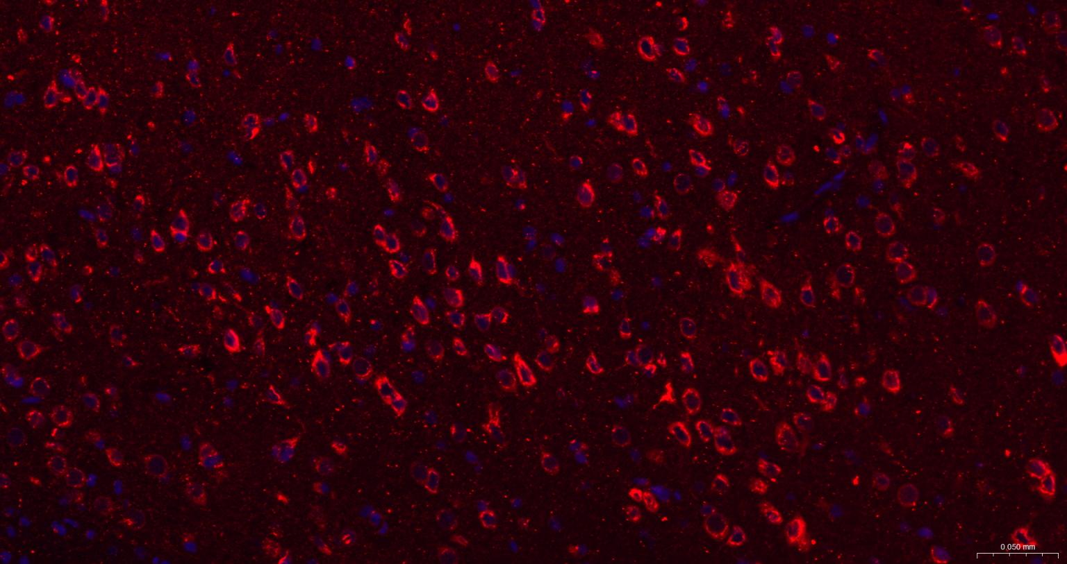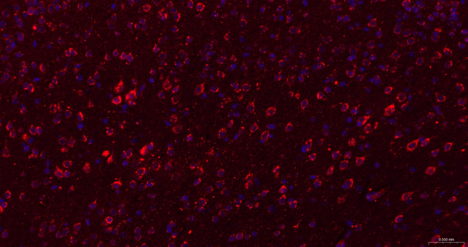 Paraformaldehyde-fixed, paraffin embedded Rat Cerebrum; Antigen retrieval by boiling in sodium citrate buffer (pH6.0) for 15 min; The section was incubated with TRPM7 Monoclonal Antibody, Unconjugated (bsm-61679R) at 1:200 overnight at 4°C. Followed by conjugated Goat Anti-Rabbit IgG antibody (Red, bs-0295G-BF594), DAPI (blue, C02-04002) was used to stain the cell nuclei.