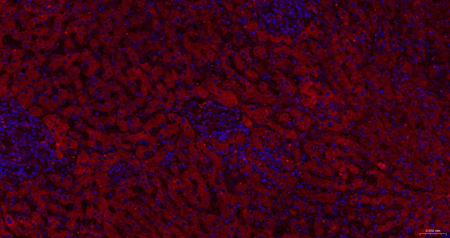 Paraformaldehyde-fixed, paraffin embedded Human Liver; Antigen retrieval by boiling in sodium citrate buffer (pH6.0) for 15 min; The section was incubated with TRPM7 Monoclonal Antibody, Unconjugated (bsm-61679R) at 1:200 overnight at 4°C. Followed by conjugated Goat Anti-Rabbit IgG antibody (Red, bs-0295G-BF594), DAPI (blue, C02-04002) was used to stain the cell nuclei.