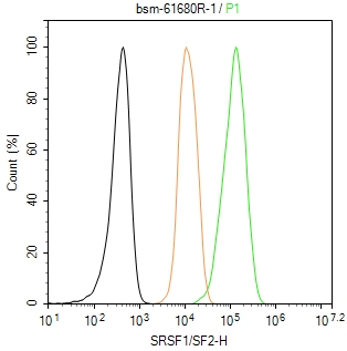 The HeLa (H) cells were fixed with 4% PFA (10 min at r.t.) and then permeabilized with 90% ice-cold methanol for 20 min at -20℃,the cells then were incubated in 5%BSA to block non-specific protein-protein interactions (30 min at r.t.), followed by secondary antibody incubation for 40 min at room temperature. Primary Antibody (green):Rabbit Anti-SRSF1/SF2 antibody (bsm-61680R,1:100); Isotype Control (orange): Rabbit IgG (bs-0295P). Blank control (black): PBS. Acquisition of 20,000 events was performed.