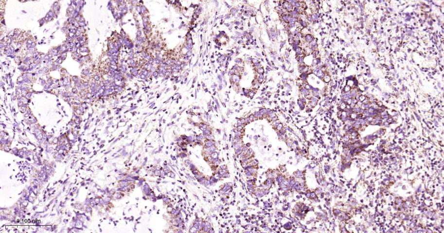 Paraformaldehyde-fixed, paraffin embedded Human Lung Cancer; Antigen retrieval by boiling in sodium citrate buffer (pH6.0) for 15 min; Antibody incubation with MtTF1 Monoclonal Antibody, Unconjugated(bsm-61684R) at 1:200 overnight at 4°C, followed by conjugation to the bs-0295G-HRP and DAB (C-0010) staining.