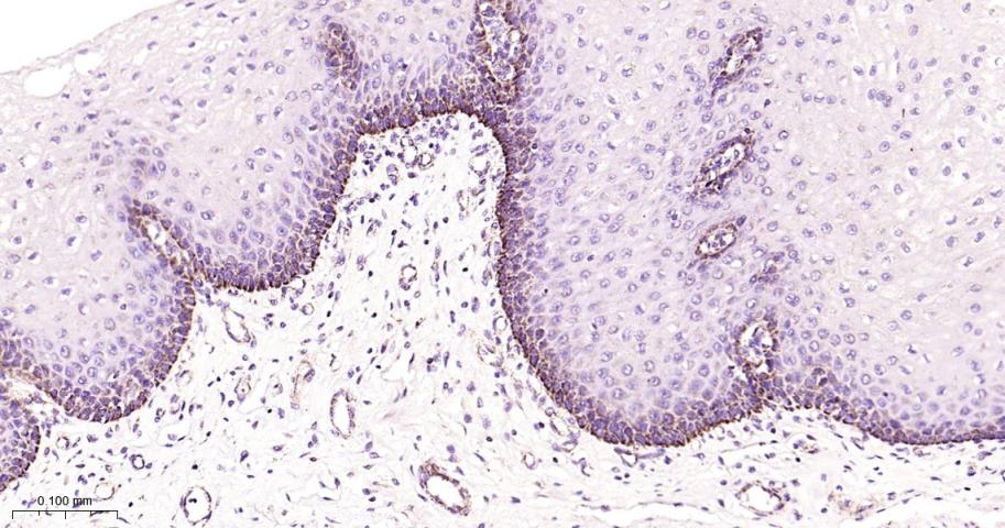 Paraformaldehyde-fixed, paraffin embedded Human Esophagus; Antigen retrieval by boiling in sodium citrate buffer (pH6.0) for 15 min; Antibody incubation with MtTF1 Monoclonal Antibody, Unconjugated(bsm-61684R) at 1:200 overnight at 4°C, followed by conjugation to the bs-0295G-HRP and DAB (C-0010) staining.