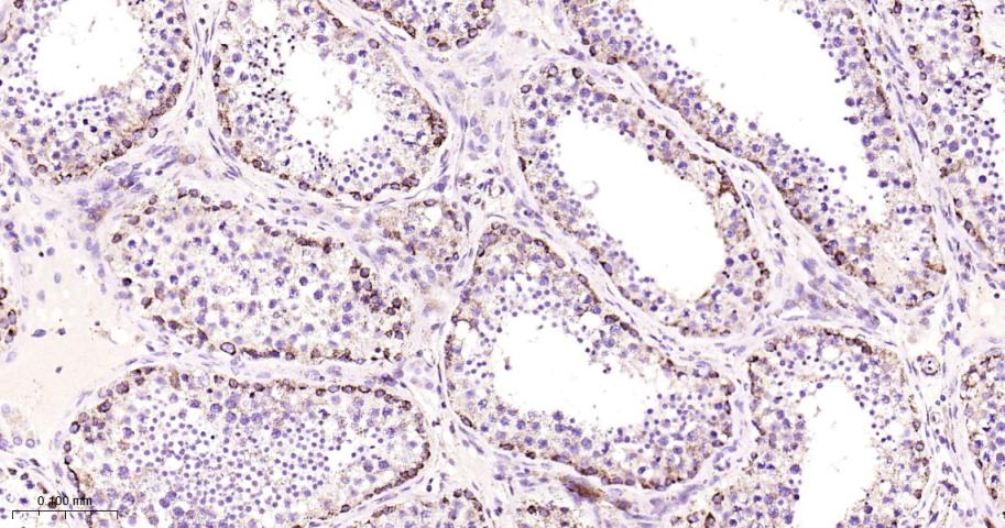 Paraformaldehyde-fixed, paraffin embedded Human Testicles; Antigen retrieval by boiling in sodium citrate buffer (pH6.0) for 15 min; Antibody incubation with MtTF1 Monoclonal Antibody, Unconjugated(bsm-61684R) at 1:200 overnight at 4°C, followed by conjugation to the bs-0295G-HRP and DAB (C-0010) staining.