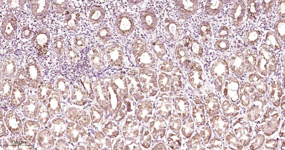 Paraformaldehyde-fixed, paraffin embedded Human Stomach; Antigen retrieval by boiling in sodium citrate buffer (pH6.0) for 15 min; Antibody incubation with MtTF1 Monoclonal Antibody, Unconjugated(bsm-61684R) at 1:200 overnight at 4°C, followed by conjugation to the bs-0295G-HRP and DAB (C-0010) staining.