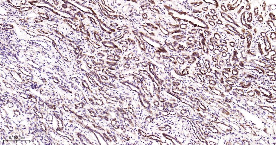 Paraformaldehyde-fixed, paraffin embedded Human Kidney; Antigen retrieval by boiling in sodium citrate buffer (pH6.0) for 15 min; Antibody incubation with MtTF1 Monoclonal Antibody, Unconjugated(bsm-61684R) at 1:200 overnight at 4°C, followed by conjugation to the bs-0295G-HRP and DAB (C-0010) staining.