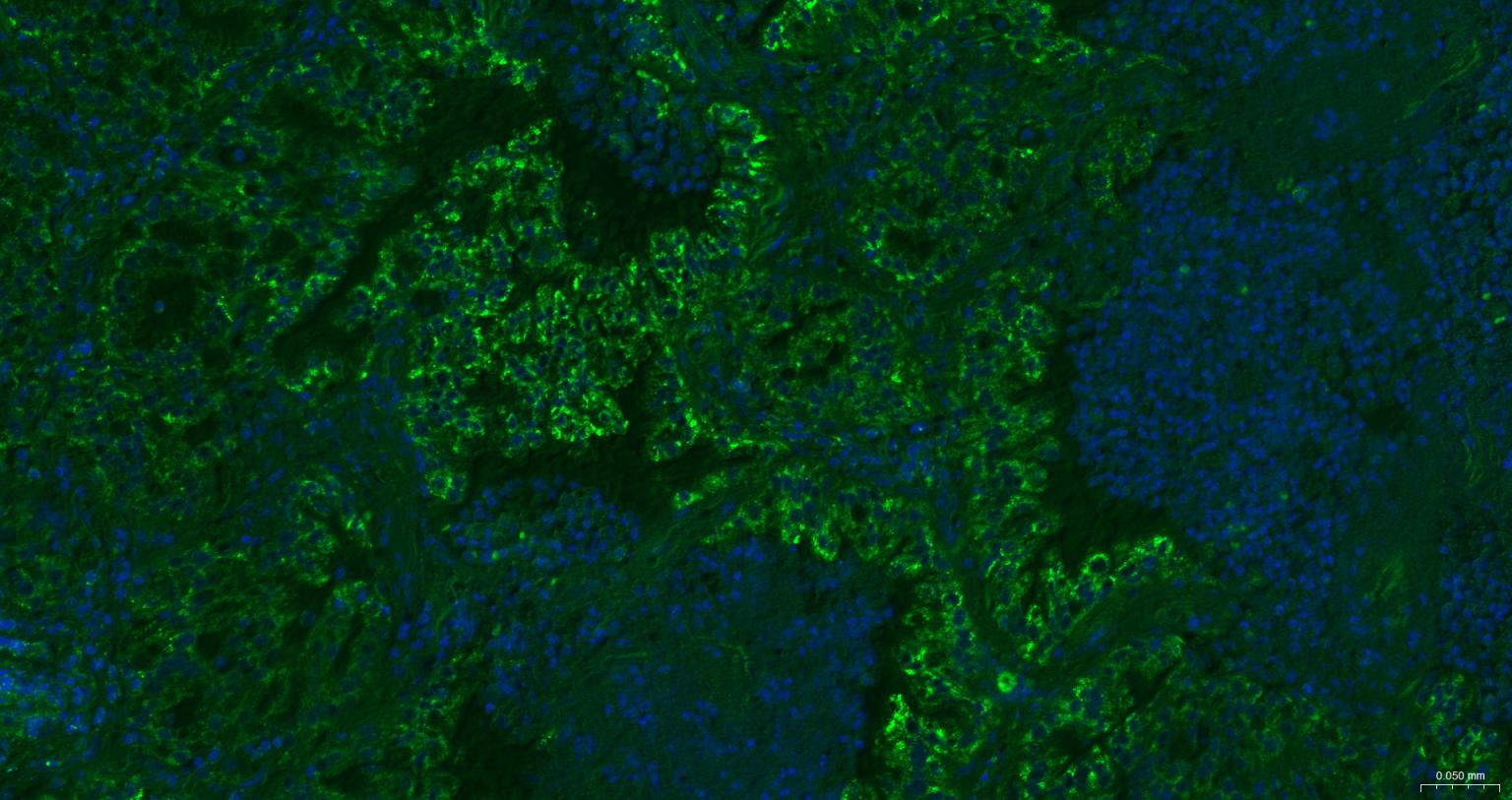 Paraformaldehyde-fixed, paraffin embedded Human Lung Cancer; Antigen retrieval by boiling in sodium citrate buffer (pH6.0) for 15 min; The section was incubated with MtTF1 Monoclonal Antibody, Unconjugated (bsm-61684R) at 1:200 overnight at 4°C. Followed by conjugated Goat Anti-Rabbit IgG antibody (Green, bs-0295G-BF488), DAPI (blue, C02-04002) was used to stain the cell nuclei.