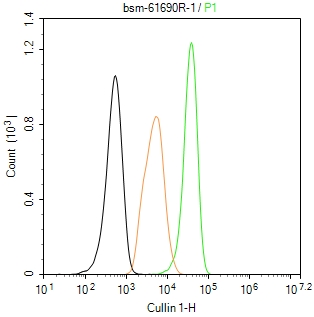 The Hela (H) cells were fixed with 4% PFA (10 min at r.t.) and then permeabilized with 90% ice-cold methanol for 20 min at -20℃,the cells then were incubated in 5%BSA to block non-specific protein-protein interactions (30 min at r.t.), followed by secondary antibody incubation for 40 min at room temperature. Primary Antibody (green):Rabbit Anti-Cullin 1 antibody (bsm-61690R,1:100); Isotype Control (orange): Rabbit IgG (bs-0295P). Blank control (black): PBS. Acquisition of 20,000 events was performed.
