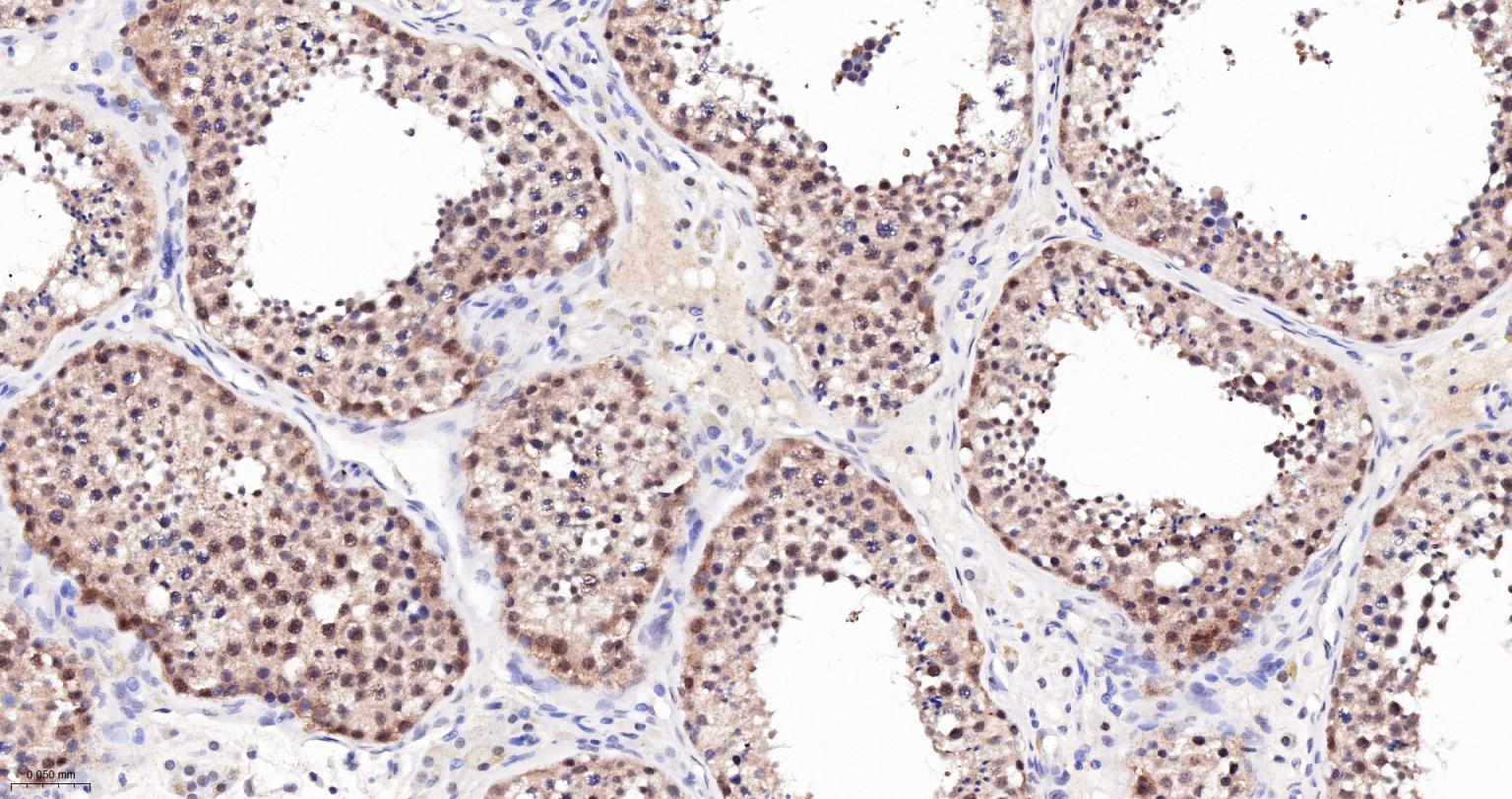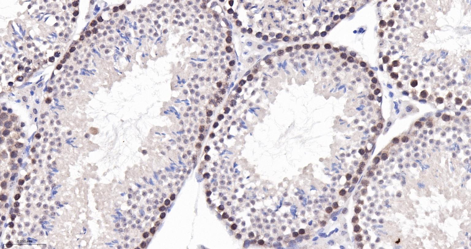 Paraformaldehyde-fixed, paraffin embedded Mouse Testicles; Antigen retrieval by boiling in sodium citrate buffer (pH6.0) for 15 min; The section was incubated with Cullin 1 Monoclonal Antibody, Unconjugated (bsm-61690R) at 1:200 overnight at 4°C, followed by conjugation to the bs-0295G-HRP and DAB (C-0010) staining.