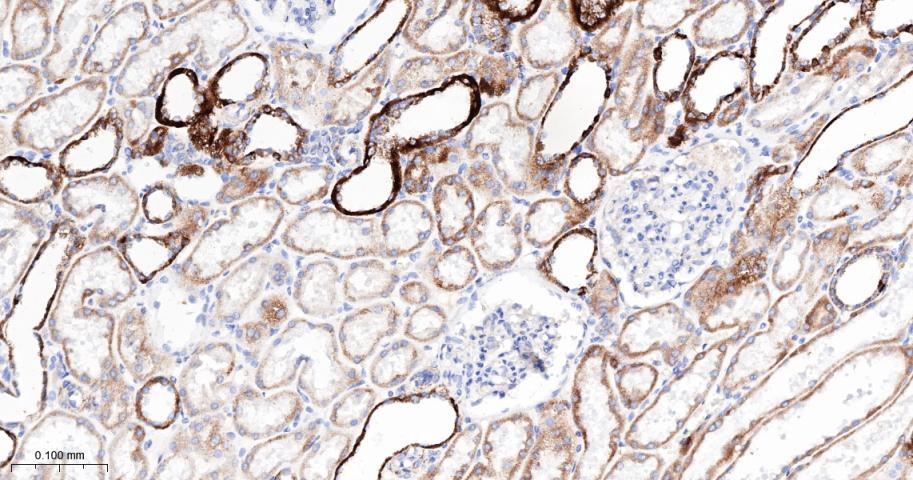 Paraformaldehyde-fixed, paraffin embedded Human Kidney; Antigen retrieval by boiling in sodium citrate buffer (pH6.0) for 15 min; The section was incubated with PDK2 Monoclonal Antibody, Unconjugated (bsm-61695R) at 1:200 overnight at 4°C, followed by conjugation to the bs-0295G-HRP and DAB (C-0010) staining.