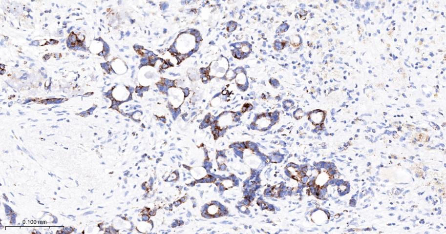 Paraformaldehyde-fixed, paraffin embedded Human Breast Cancer; Antigen retrieval by boiling in sodium citrate buffer (pH6.0) for 15 min; The section was incubated with PDK2 Monoclonal Antibody, Unconjugated (bsm-61695R) at 1:200 overnight at 4°C, followed by conjugation to the bs-0295G-HRP and DAB (C-0010) staining.