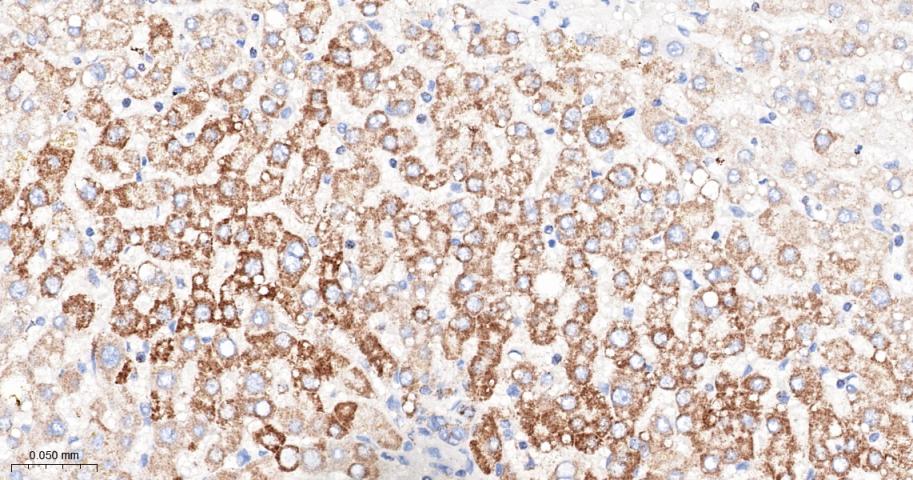 Paraformaldehyde-fixed, paraffin embedded Human Liver; Antigen retrieval by boiling in sodium citrate buffer (pH6.0) for 15 min; The section was incubated with PDK2 Monoclonal Antibody, Unconjugated (bsm-61695R) at 1:200 overnight at 4°C, followed by conjugation to the bs-0295G-HRP and DAB (C-0010) staining.