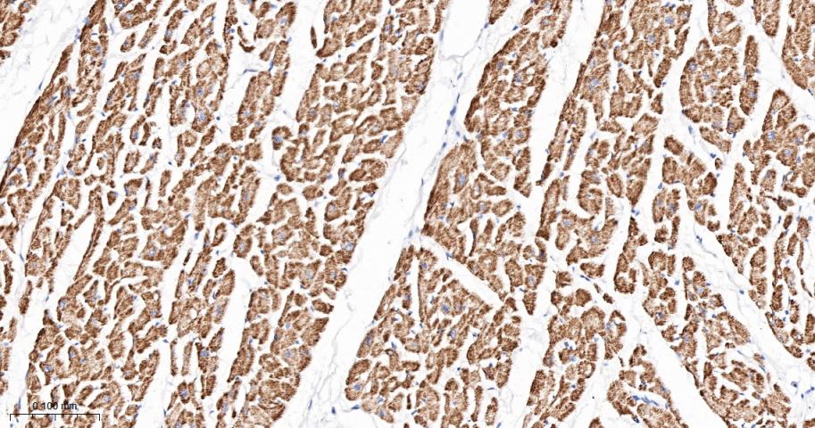 Paraformaldehyde-fixed, paraffin embedded Human Heart; Antigen retrieval by boiling in sodium citrate buffer (pH6.0) for 15 min; The section was incubated with PDK2 Monoclonal Antibody, Unconjugated (bsm-61695R) at 1:200 overnight at 4°C, followed by conjugation to the bs-0295G-HRP and DAB (C-0010) staining.