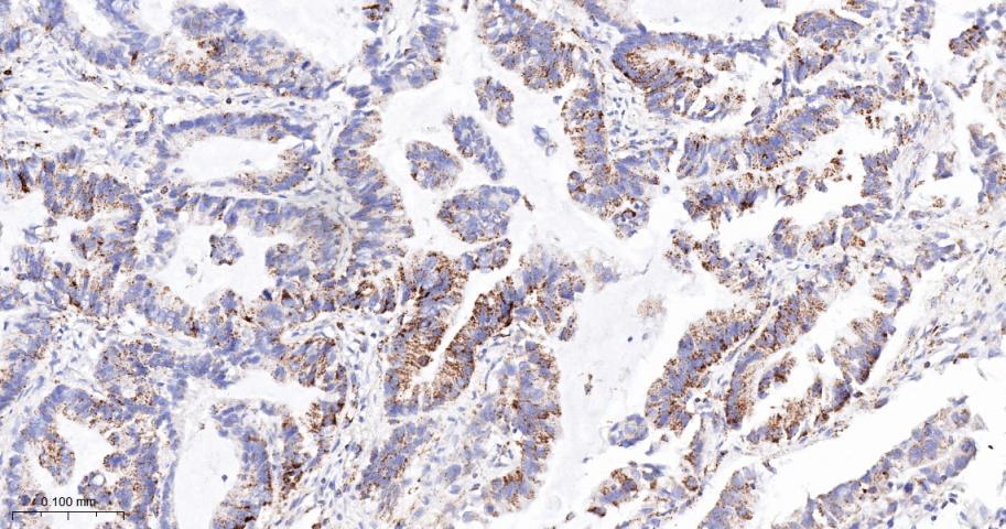 Paraformaldehyde-fixed, paraffin embedded Human Lung Cancer; Antigen retrieval by boiling in sodium citrate buffer (pH6.0) for 15 min; The section was incubated with PDK2 Monoclonal Antibody, Unconjugated (bsm-61695R) at 1:200 overnight at 4°C, followed by conjugation to the bs-0295G-HRP and DAB (C-0010) staining.