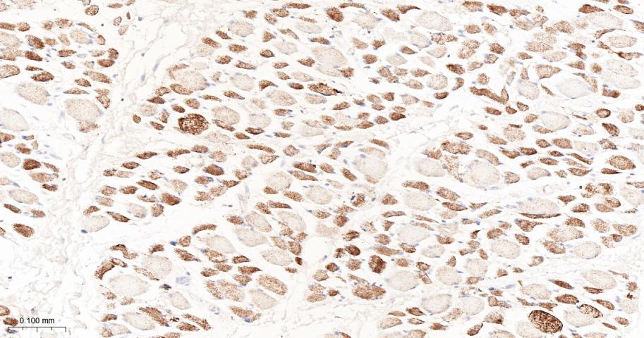 Paraformaldehyde-fixed, paraffin embedded Human Skeletal muscle; Antigen retrieval by boiling in sodium citrate buffer (pH6.0) for 15 min; The section was incubated with PDK2 Monoclonal Antibody, Unconjugated (bsm-61695R) at 1:200 overnight at 4°C, followed by conjugation to the bs-0295G-HRP and DAB (C-0010) staining.