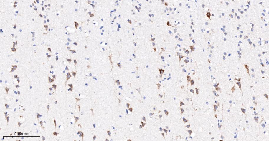 Paraformaldehyde-fixed, paraffin embedded Human Cerebrum; Antigen retrieval by boiling in sodium citrate buffer (pH6.0) for 15 min; The section was incubated with PDK2 Monoclonal Antibody, Unconjugated (bsm-61695R) at 1:200 overnight at 4°C, followed by conjugation to the bs-0295G-HRP and DAB (C-0010) staining.