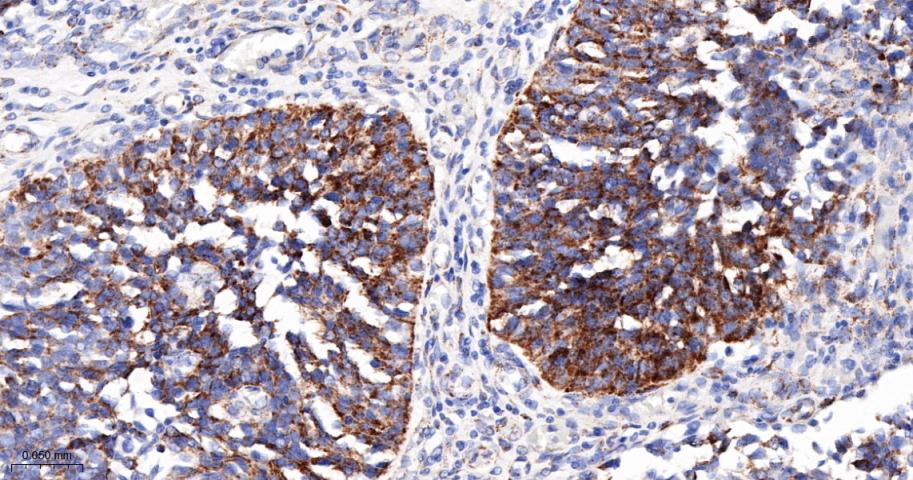 Paraformaldehyde-fixed, paraffin embedded Human Invasive urothelial carcinoma of the bladder; Antigen retrieval by boiling in sodium citrate buffer (pH6.0) for 15 min; The section was incubated with PDK2 Monoclonal Antibody, Unconjugated (bsm-61695R) at 1:200 overnight at 4°C, followed by conjugation to the bs-0295G-HRP and DAB (C-0010) staining.