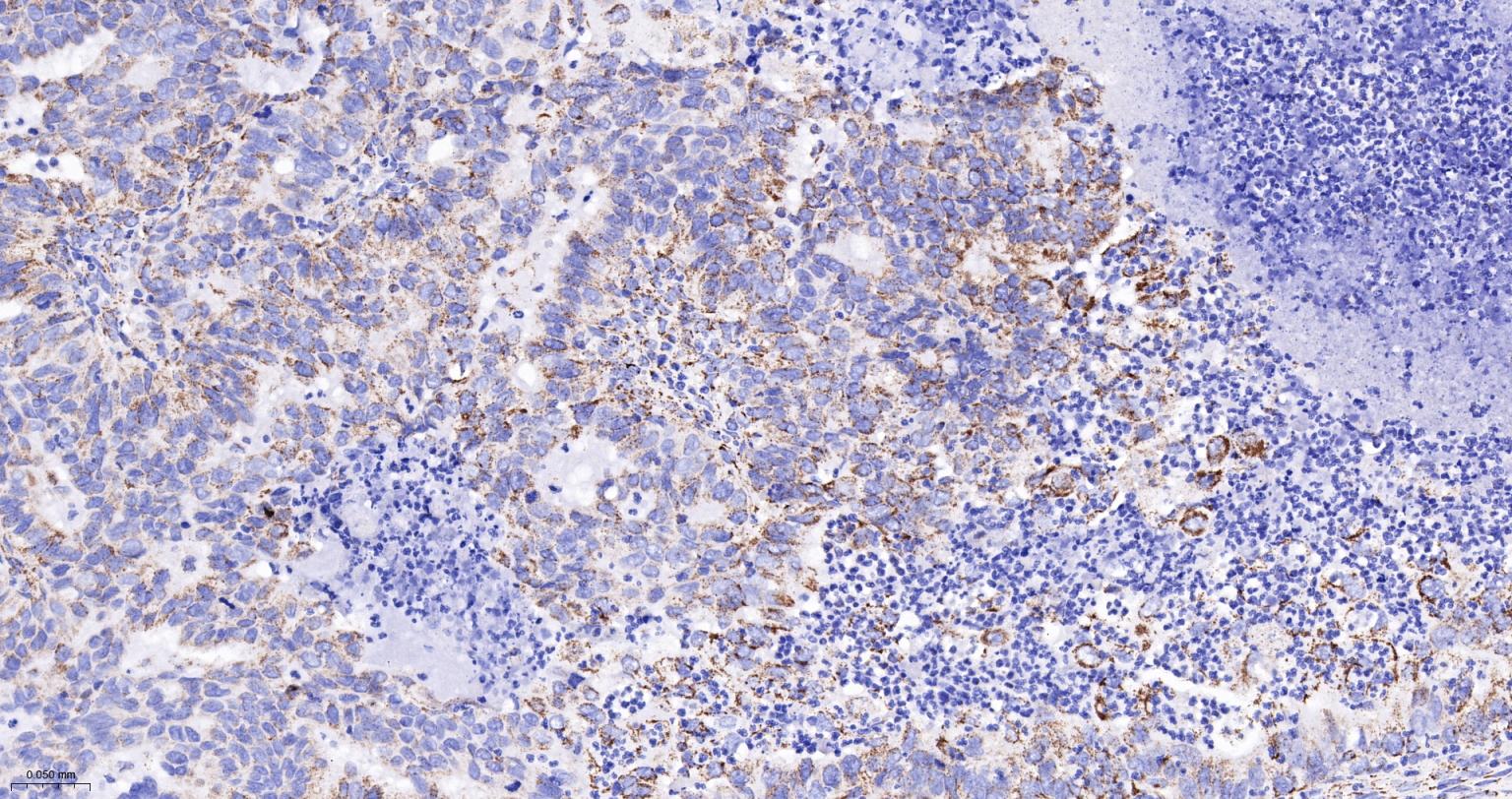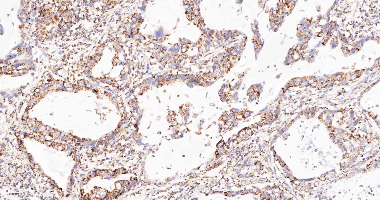 Paraformaldehyde-fixed, paraffin embedded Human Lung Cancer; Antigen retrieval by boiling in sodium citrate buffer (pH6.0) for 15 min; The section was incubated with PDHB Monoclonal Antibody, Unconjugated (bsm-61702R) at 1:200 overnight at 4°C, followed by conjugation to the bs-0295G-HRP and DAB (C-0010) staining.
