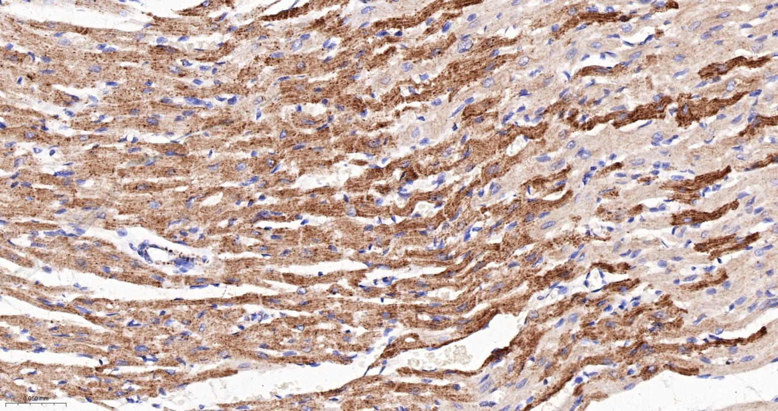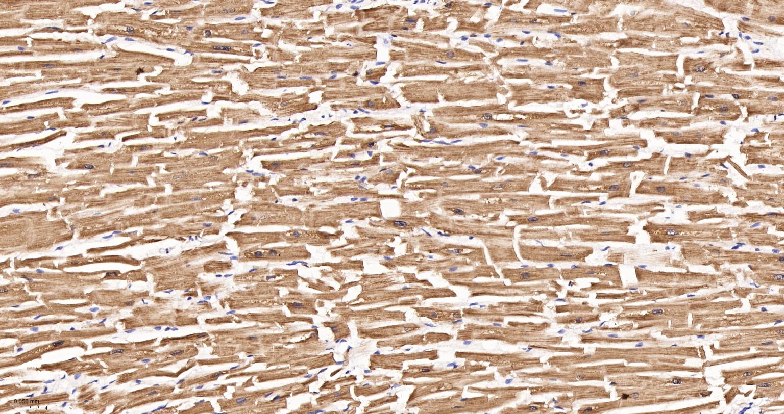 Paraformaldehyde-fixed, paraffin embedded Rat Heart; Antigen retrieval by boiling in sodium citrate buffer (pH6.0) for 15 min; The section was incubated with PDHB Monoclonal Antibody, Unconjugated (bsm-61702R) at 1:200 overnight at 4°C, followed by conjugation to the bs-0295G-HRP and DAB (C-0010) staining.