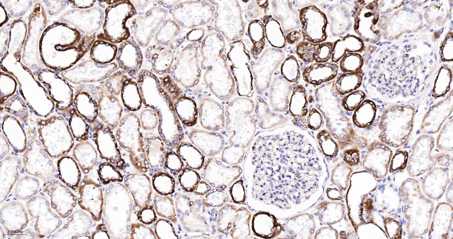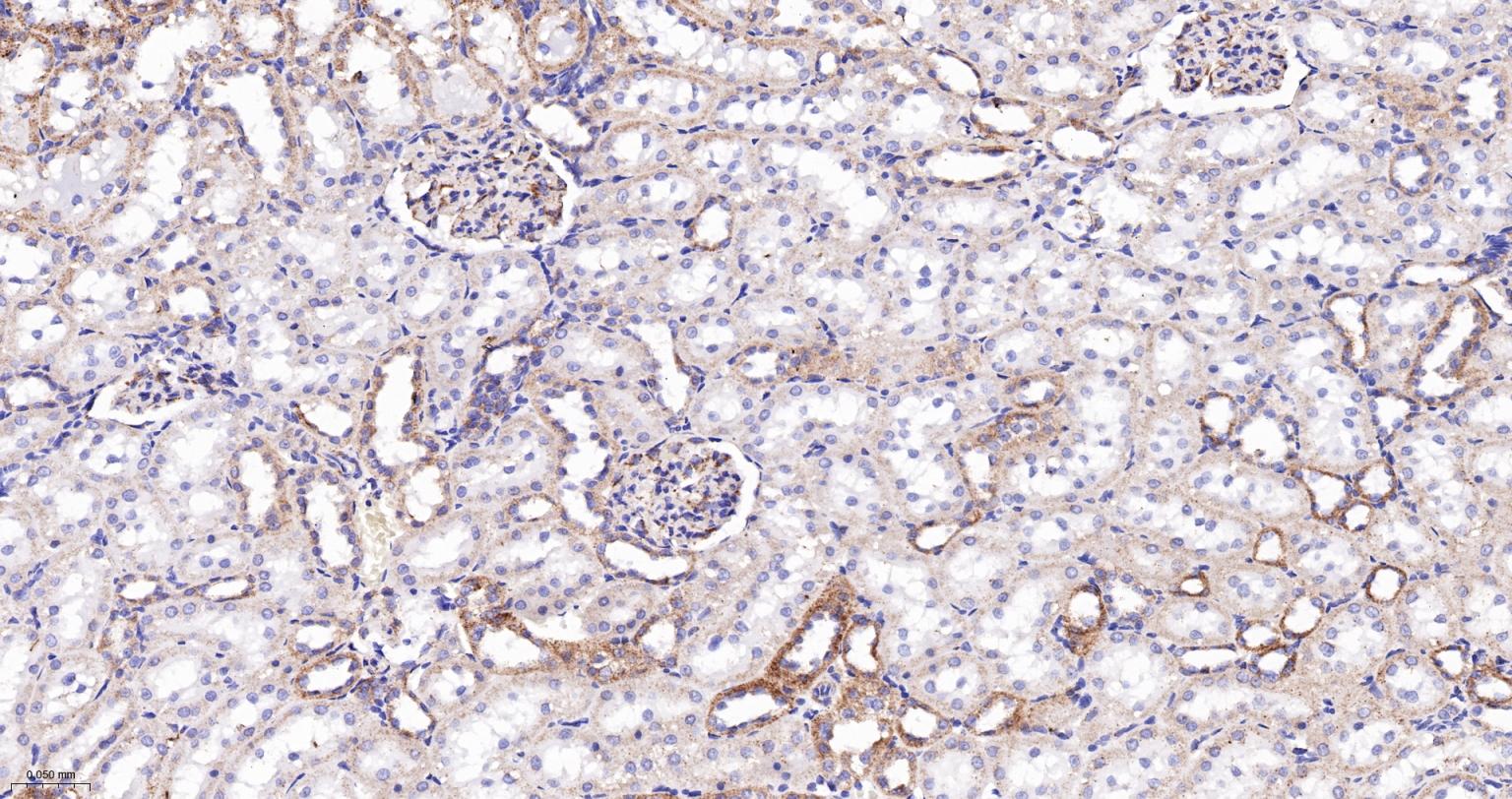 Paraformaldehyde-fixed, paraffin embedded Rat Kidney; Antigen retrieval by boiling in sodium citrate buffer (pH6.0) for 15 min; The section was incubated with PDHB Monoclonal Antibody, Unconjugated (bsm-61702R) at 1:200 overnight at 4°C, followed by conjugation to the bs-0295G-HRP and DAB (C-0010) staining.