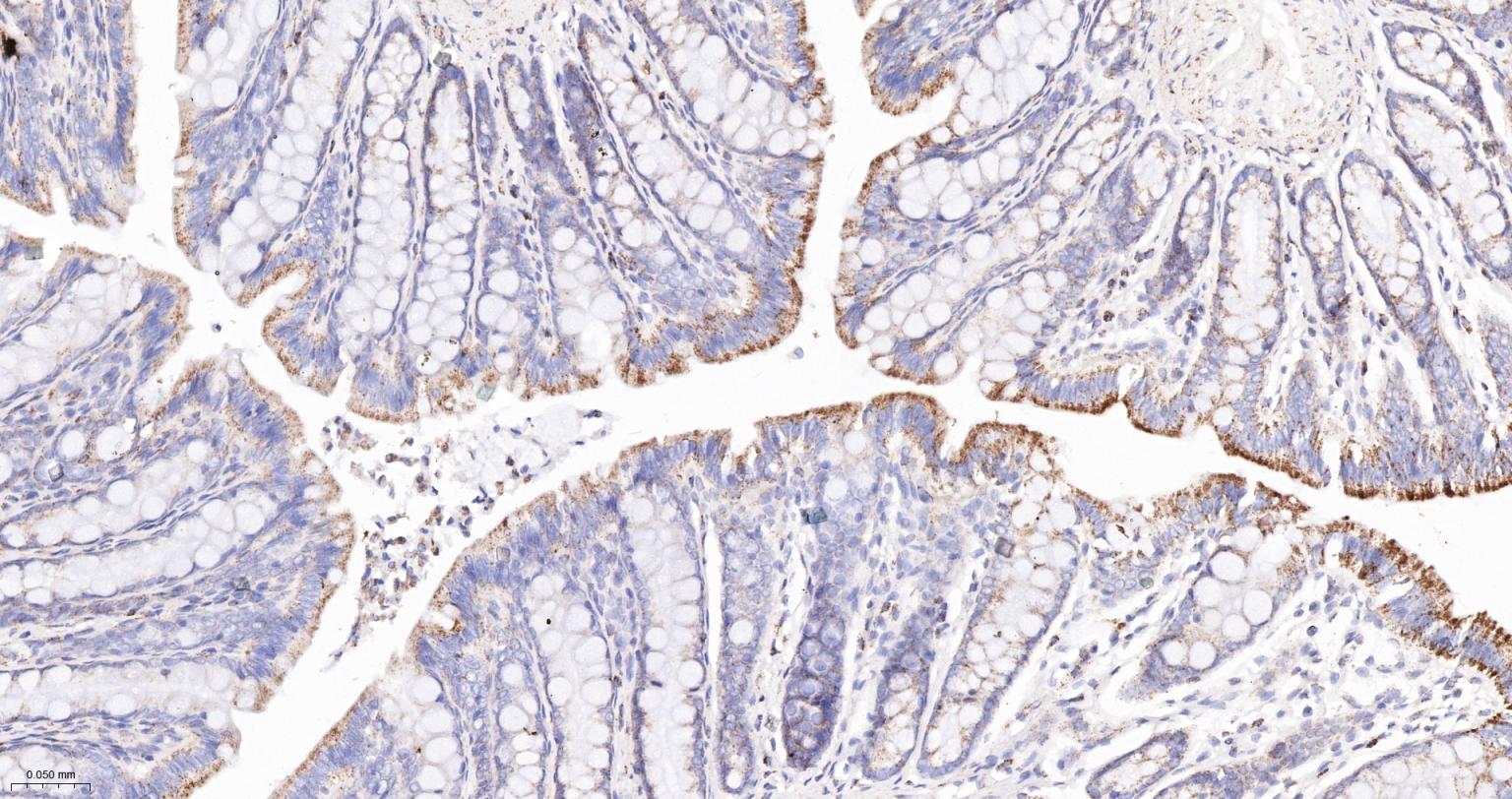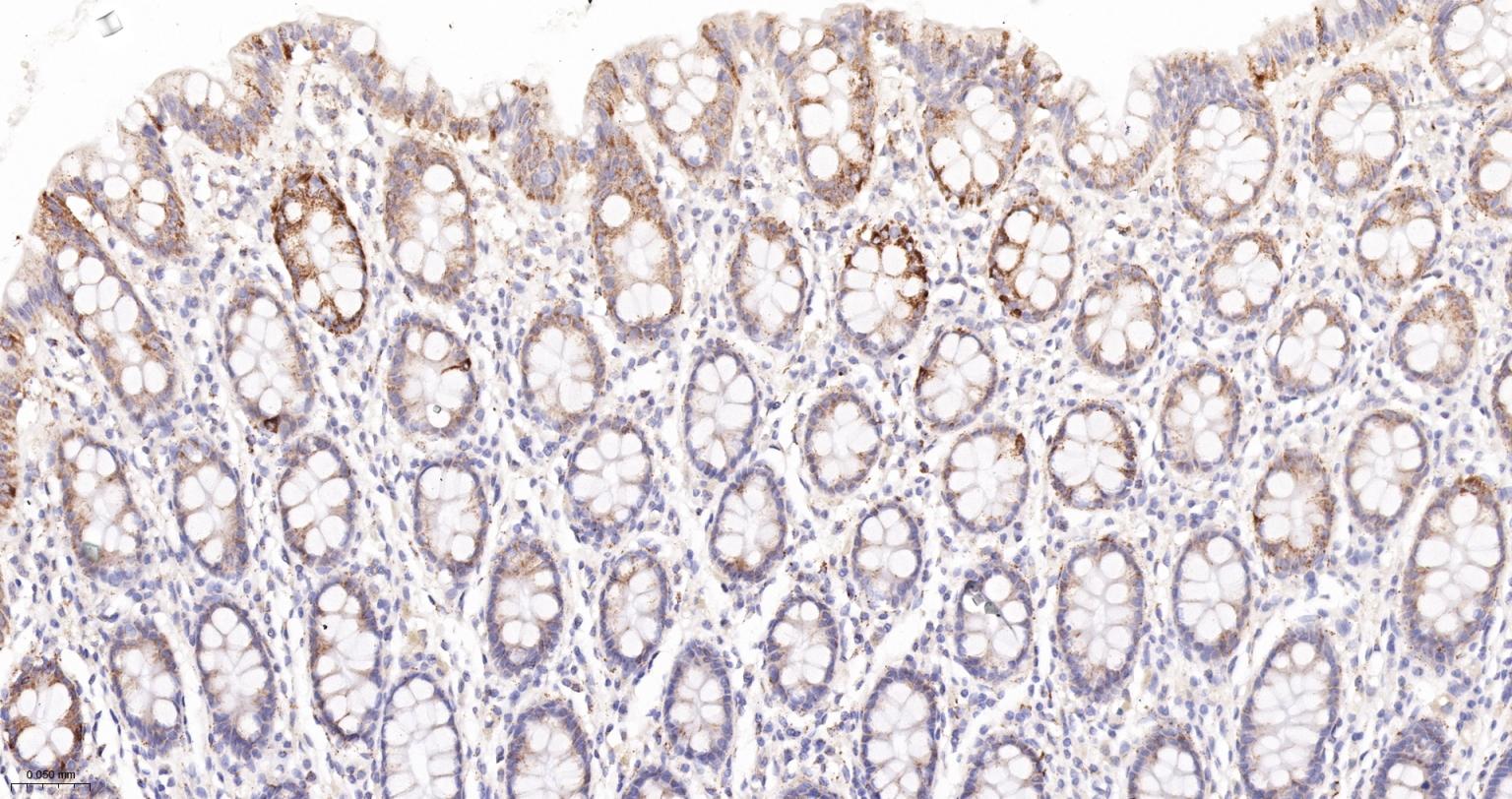 Paraformaldehyde-fixed, paraffin embedded Rat Colon; Antigen retrieval by boiling in sodium citrate buffer (pH6.0) for 15 min; The section was incubated with PDHB Monoclonal Antibody, Unconjugated (bsm-61702R) at 1:200 overnight at 4°C, followed by conjugation to the bs-0295G-HRP and DAB (C-0010) staining.
