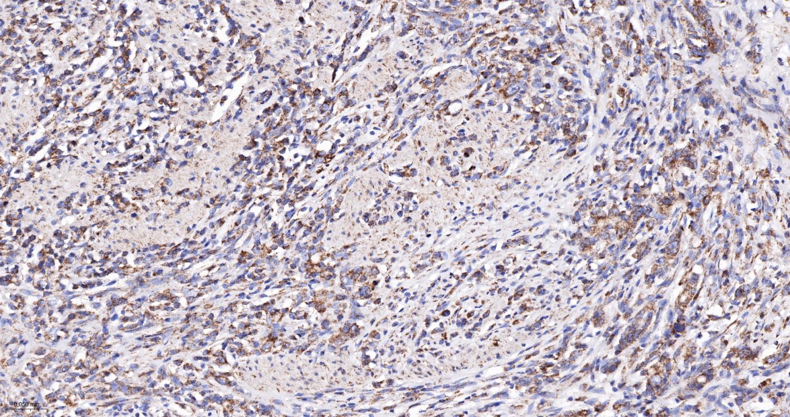 Paraformaldehyde-fixed, paraffin embedded Human Gastric Cancer; Antigen retrieval by boiling in sodium citrate buffer (pH6.0) for 15 min; The section was incubated with PDHB Monoclonal Antibody, Unconjugated (bsm-61702R) at 1:200 overnight at 4°C, followed by conjugation to the bs-0295G-HRP and DAB (C-0010) staining.