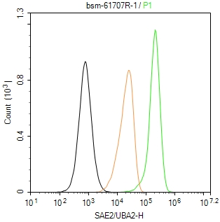The A549 (H) cells were fixed with 4% PFA (10 min at r.t.) and then permeabilized with 90% ice-cold methanol for 20 min at -20℃,the cells then were incubated in 5%BSA to block non-specific protein-protein interactions (30 min at r.t.), followed by secondary antibody incubation for 40 min at room temperature. Primary Antibody (green):Rabbit Anti-SAE2/UBA2 antibody (bsm-61707R,1:100); Isotype Control (orange): Rabbit IgG (bs-0295P). Blank control (black): PBS. Acquisition of 20,000 events was performed.
