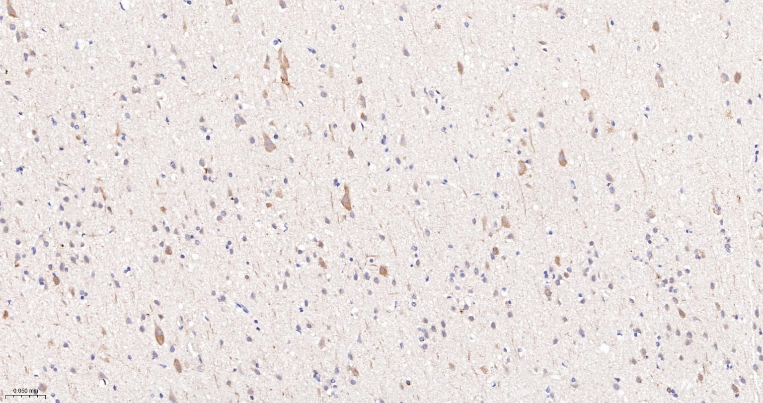 Paraformaldehyde-fixed, paraffin embedded Human Cerebrum; Antigen retrieval by boiling in sodium citrate buffer (pH6.0) for 15 min; The section was incubated with GRK3 Monoclonal Antibody, Unconjugated (bsm-61714R) at 1:200 overnight at 4°C, followed by conjugation to the bs-0295G-HRP and DAB (C-0010) staining.