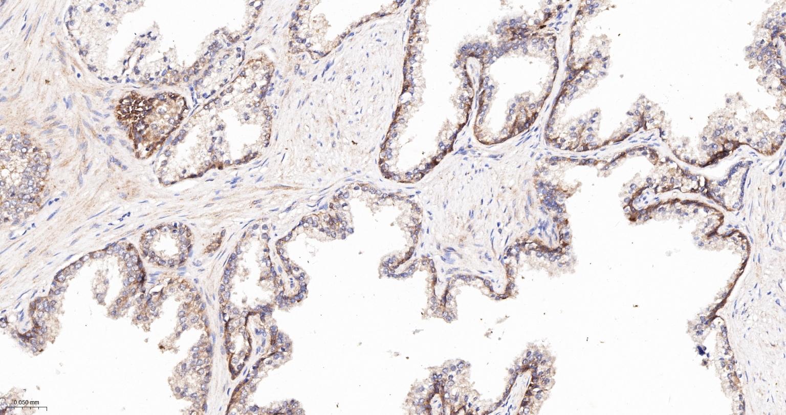 Paraformaldehyde-fixed, paraffin embedded Human Prostate Cancer; Antigen retrieval by boiling in sodium citrate buffer (pH6.0) for 15 min; The section was incubated with GRK3 Monoclonal Antibody, Unconjugated (bsm-61714R) at 1:200 overnight at 4°C, followed by conjugation to the bs-0295G-HRP and DAB (C-0010) staining.