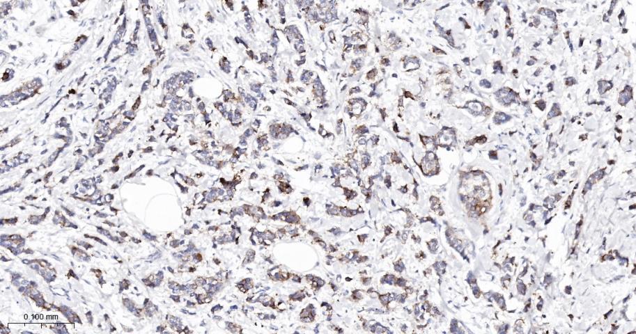 Paraformaldehyde-fixed, paraffin embedded Human Breast Cancer; Antigen retrieval by boiling in sodium citrate buffer (pH6.0) for 15 min; The section was incubated with IGFBP2 Monoclonal Antibody, Unconjugated (bsm-61716R) at 1:200 overnight at 4°C, followed by conjugation to the bs-0295G-HRP and DAB (C-0010) staining.