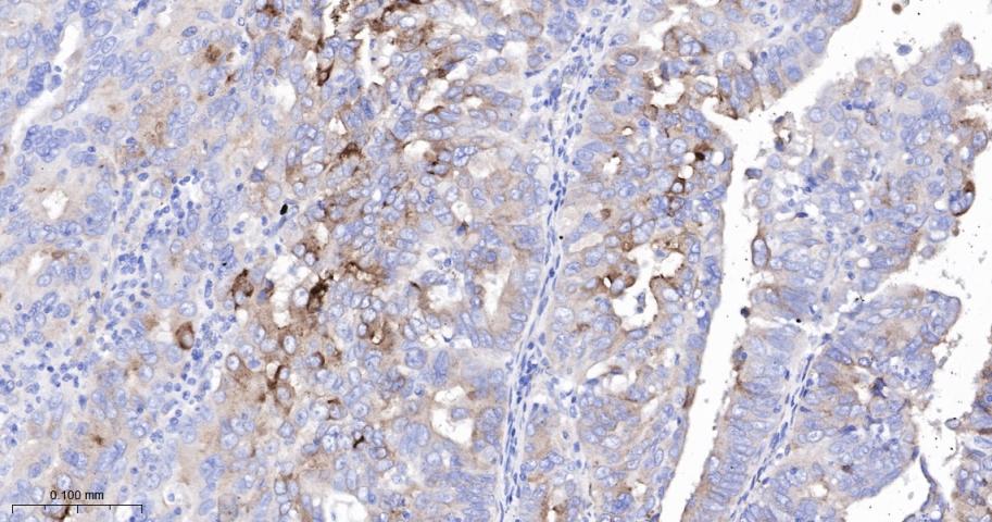 Paraformaldehyde-fixed, paraffin embedded Human Endometrial Cancer; Antigen retrieval by boiling in sodium citrate buffer (pH6.0) for 15 min; The section was incubated with IGFBP2 Monoclonal Antibody, Unconjugated (bsm-61716R) at 1:200 overnight at 4°C, followed by conjugation to the bs-0295G-HRP and DAB (C-0010) staining.