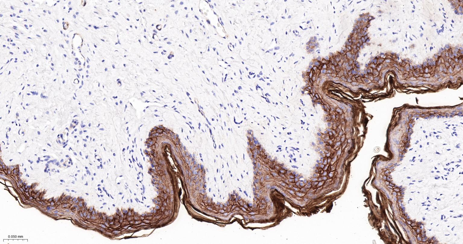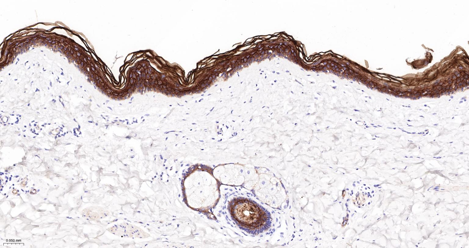 Paraformaldehyde-fixed, paraffin embedded Human Skin; Antigen retrieval by boiling in sodium citrate buffer (pH6.0) for 15 min; The section was incubated with PERP Monoclonal Antibody, Unconjugated (bsm-61725R) at 1:200 overnight at 4°C, followed by conjugation to the bs-0295G-HRP and DAB (C-0010) staining.