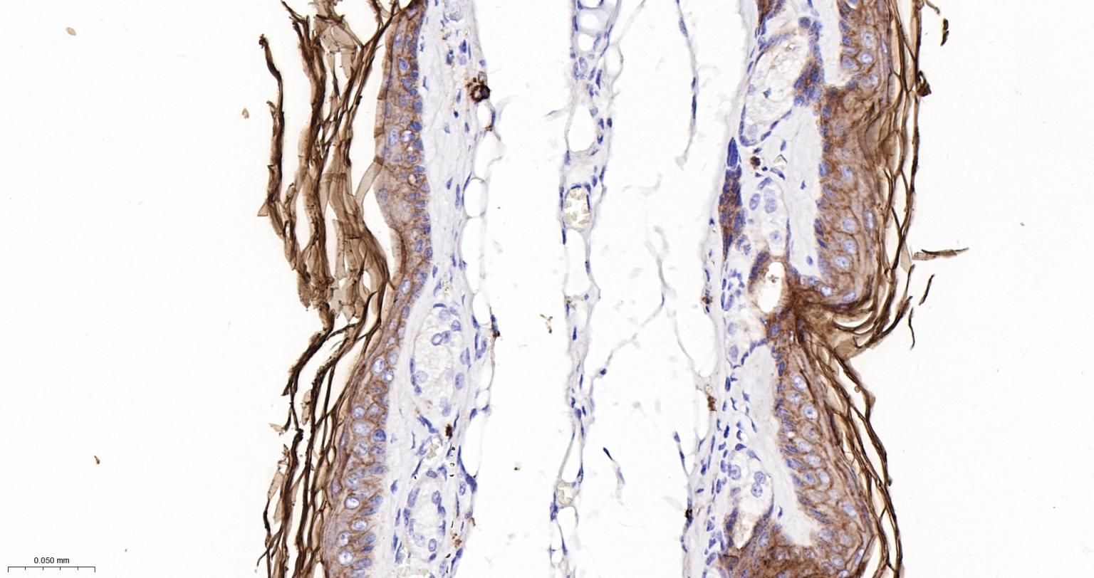Paraformaldehyde-fixed, paraffin embedded Mouse Skin; Antigen retrieval by boiling in sodium citrate buffer (pH6.0) for 15 min; The section was incubated with PERP Monoclonal Antibody, Unconjugated (bsm-61725R) at 1:200 overnight at 4°C, followed by conjugation to the bs-0295G-HRP and DAB (C-0010) staining.