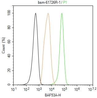 The Hela (H) cells were fixed with 4% PFA (10 min at r.t.) and then permeabilized with 90% ice-cold methanol for 20 min at -20℃,the cells then were incubated in 5%BSA to block non-specific protein-protein interactions (30 min at r.t.), followed by secondary antibody incubation for 40 min at room temperature. Primary Antibody (green):Rabbit Anti-BAF53A antibody (bsm-61726R,1:100); Isotype Control (orange): Rabbit IgG (bs-0295P). Blank control (black): PBS. Acquisition of 20,000 events was performed.