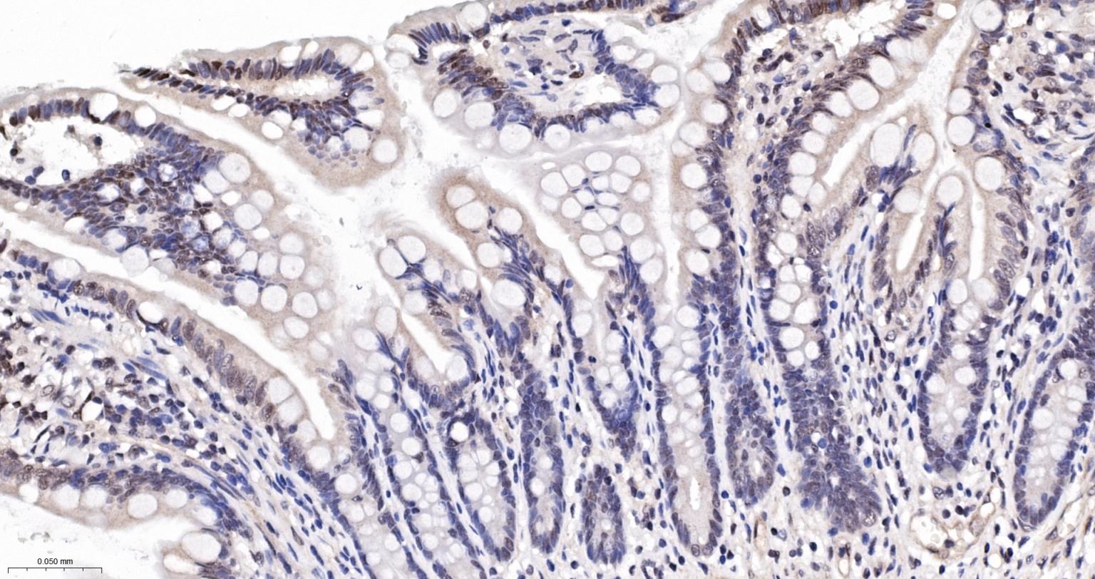 Paraformaldehyde-fixed, paraffin embedded Human Small Intestine; Antigen retrieval by boiling in sodium citrate buffer (pH6.0) for 15 min; The section was incubated with BAF53A Monoclonal Antibody, Unconjugated (bsm-61726R) at 1:200 overnight at 4°C, followed by conjugation to the bs-0295G-HRP and DAB (C-0010) staining.